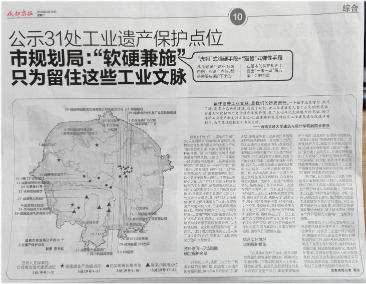 據(jù)成都商報(bào)2016年4月26日第十版訊,為了有針對(duì)性地保護(hù)成都珍貴的工業(yè)遺產(chǎn),成都市規(guī)劃局通過(guò)對(duì)中心城區(qū)現(xiàn)存工業(yè)點(diǎn)位的梳理和評(píng)價(jià),規(guī)劃推薦工業(yè)遺產(chǎn)點(diǎn)位共31處,其中已列入文保單位、優(yōu)秀近現(xiàn)代建筑點(diǎn)位3處,保留原生產(chǎn)功能點(diǎn)位5處,已實(shí)現(xiàn)再利用點(diǎn)位8處,帶保護(hù)利用點(diǎn)位15處。