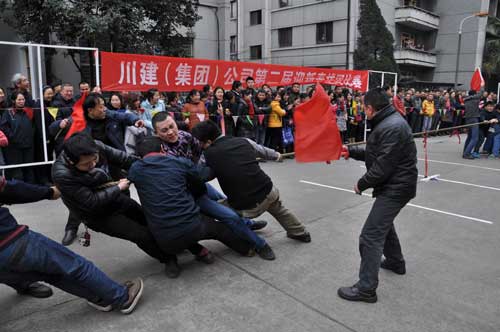 2015年1月,川建(集團(tuán))開展“迎春拔河比賽”活動(dòng),活動(dòng)主旨為豐富員工的文化生活,增強(qiáng)員工的體育鍛煉意識(shí),提高團(tuán)隊(duì)合作精神,進(jìn)一步增強(qiáng)企業(yè)凝聚力。