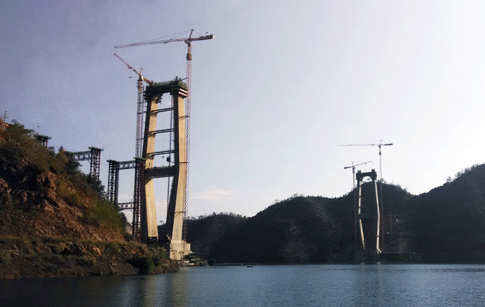 項(xiàng)目地點(diǎn):貴州紅水河特大橋兩側(cè)橋墩高度均為210米,每個橋墩的起重機(jī)械配置均為川建生產(chǎn)的一臺C7036塔機(jī)、一臺C7030塔機(jī)和兩臺SC200/200WPZ中速變頻施工梯,副墩的施工機(jī)械為一臺P125平頭式塔機(jī)。